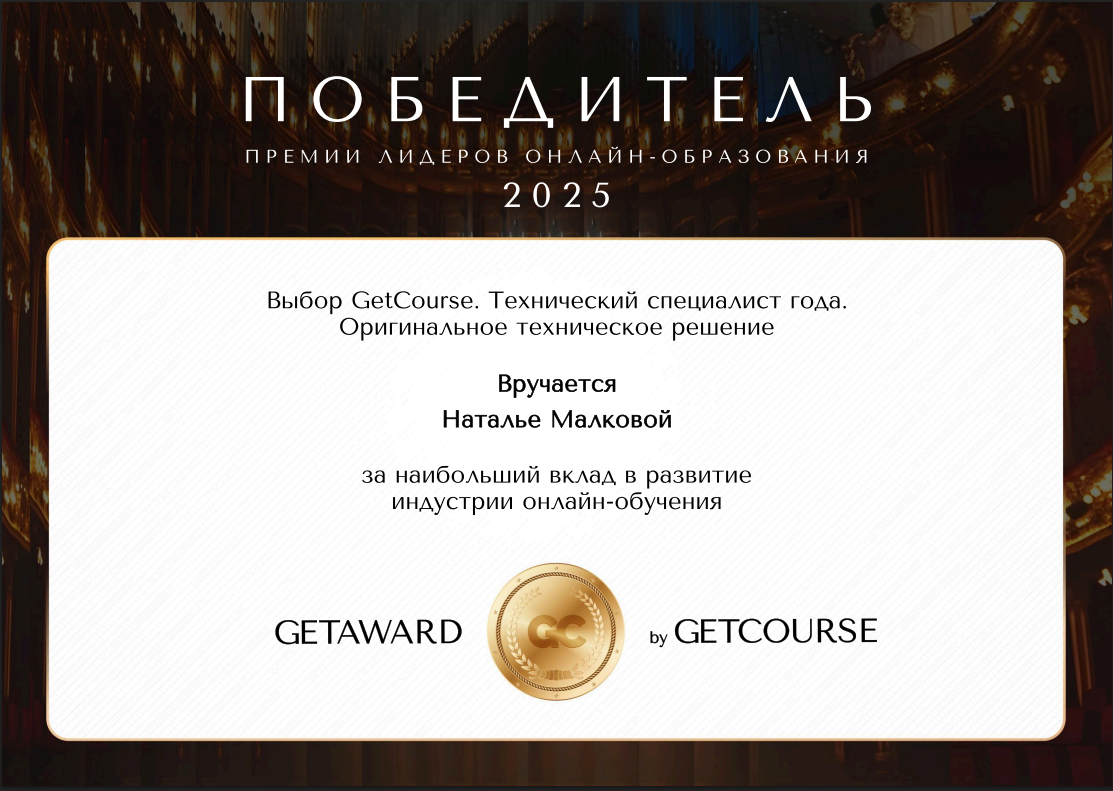 - Победитель премии GETAWARD-2025 в номинации «Технический специалист года. Выбор GetCourse».